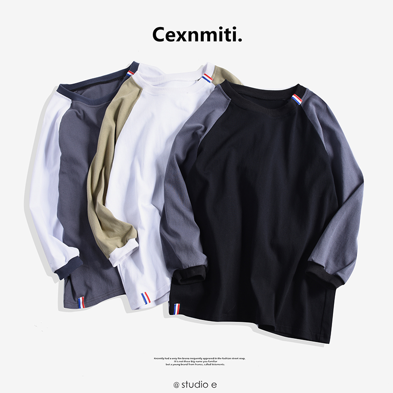 男裝17新款韓版插肩袖圓領男士寬松七分袖拼色男T恤