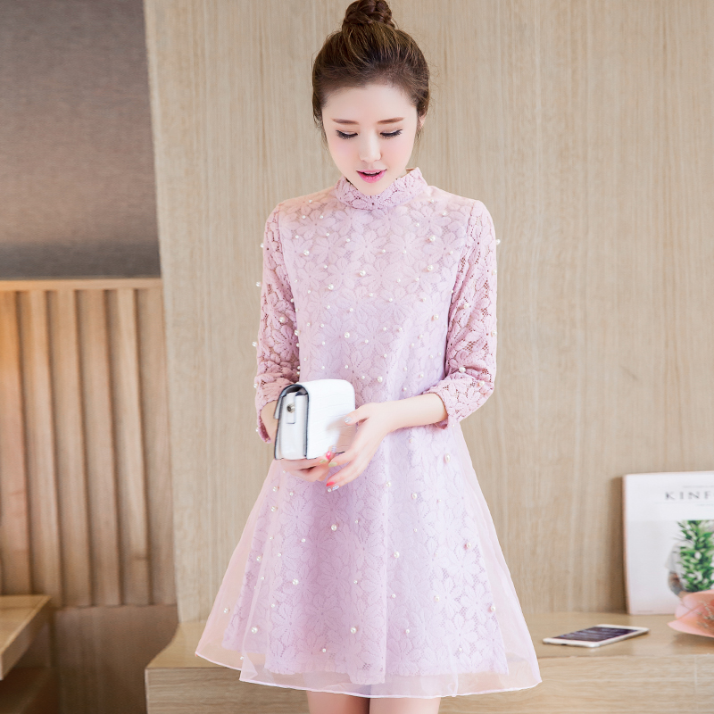 / 春季新款甜美氣質顯瘦歐根紗拼接蕾絲釘珠七分袖連衣裙女A字
