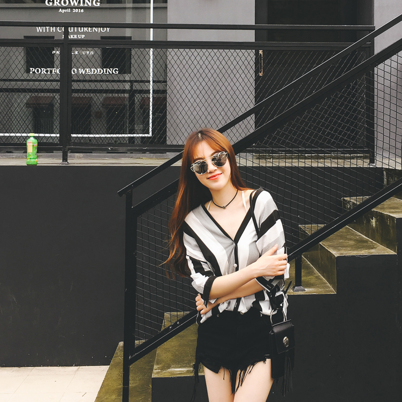 / 雪紡襯衫女夏韓范寬松短袖學生2017簡約百搭中長款條紋顯瘦上衣潮