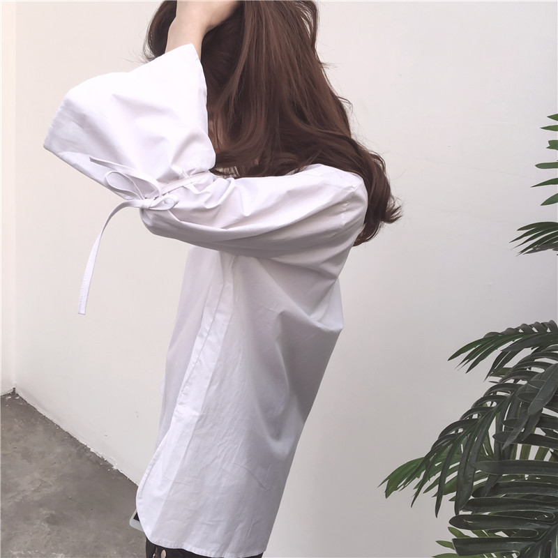 / ulzzang學院風百搭寬松V領前短后長系帶襯衫燈籠喇叭袖白色襯衣女