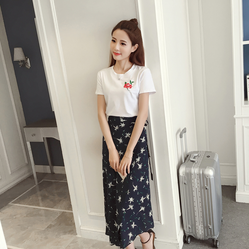 / 夏季新款女裝白色刺繡玫瑰短袖T恤+復古碎花雪紡半身長裙套裝