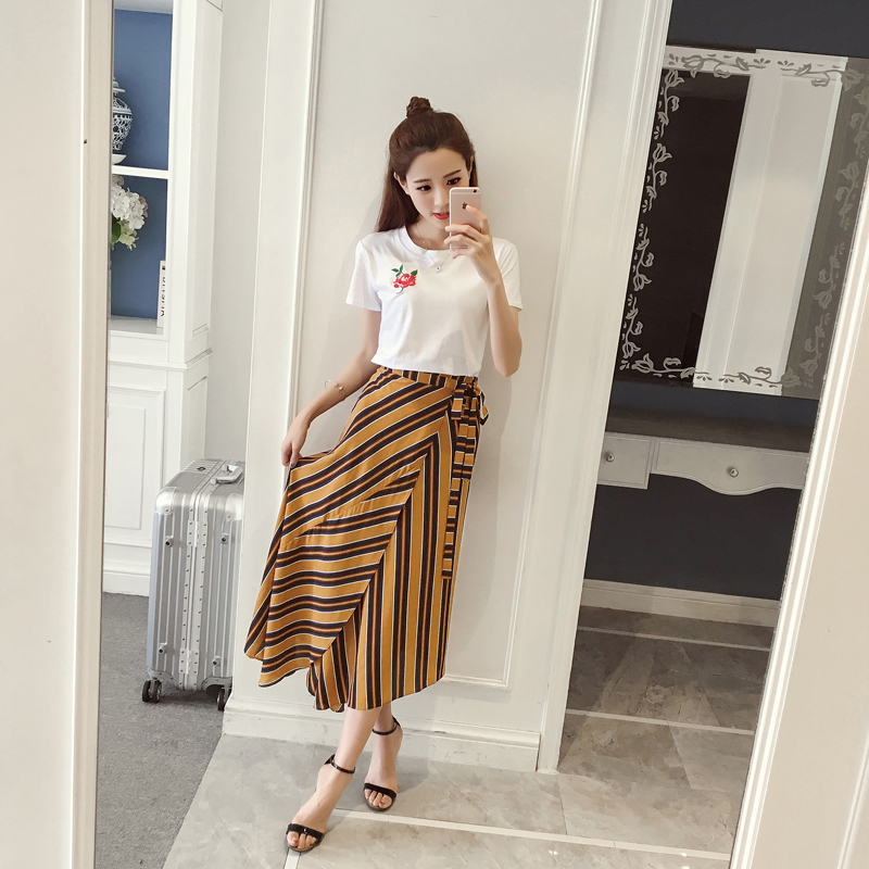 夏季新款女裝白色刺繡玫瑰短袖T恤+復古碎花雪紡半身長裙套裝