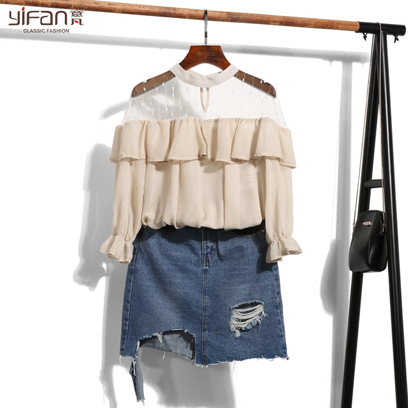 / 春夏新款甜美性感鏤空網紗拼接荷葉邊七分袖雪紡衫喇叭袖純色