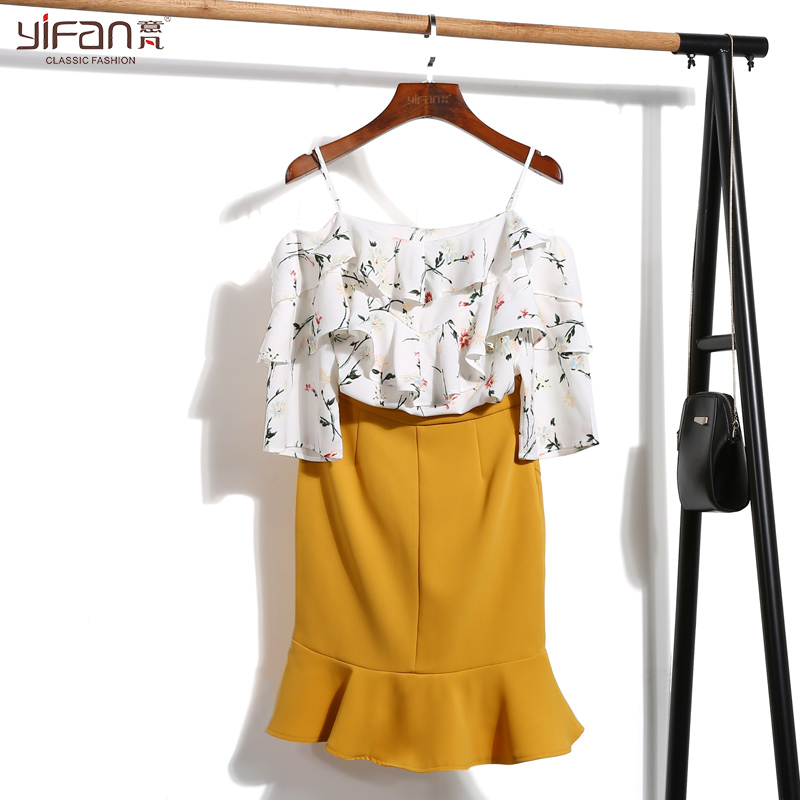 / 雪紡衫短袖夏季新款甜美荷葉邊吊帶一字肩露肩顯瘦碎花上衣女