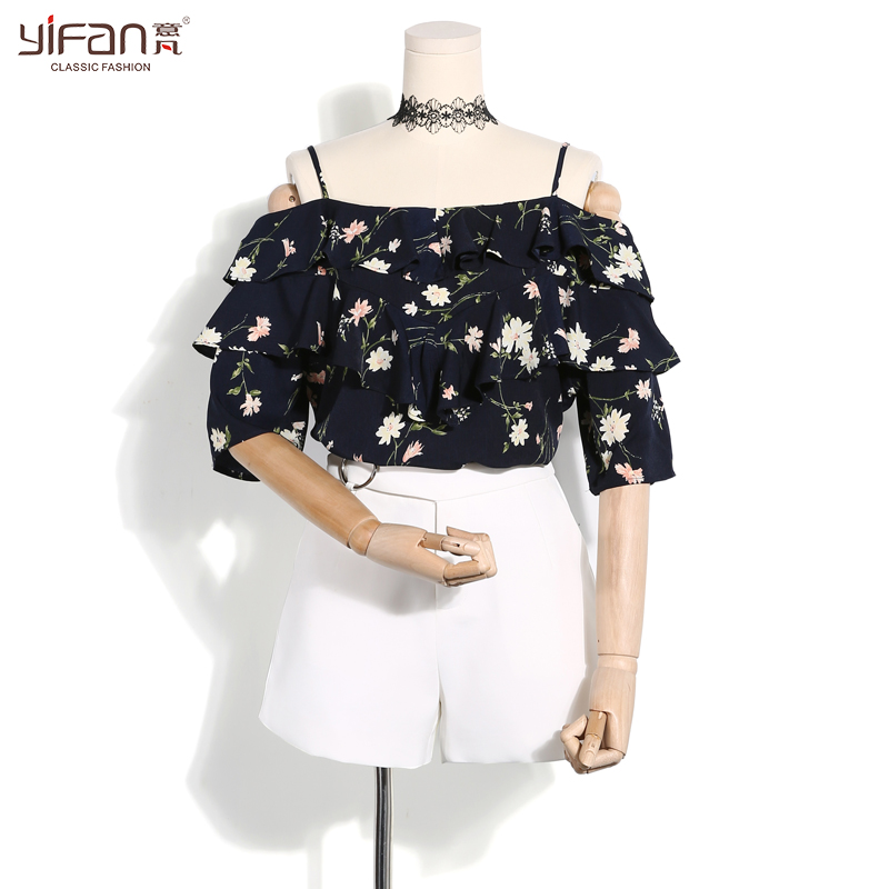 雪紡衫短袖夏季新款甜美荷葉邊吊帶一字肩露肩顯瘦碎花上衣女