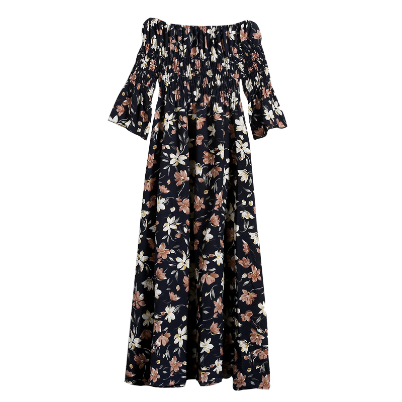 / 夏季沙灘裙抹胸雪紡海邊度假碎花連衣裙女波西米亞長裙一字領露肩