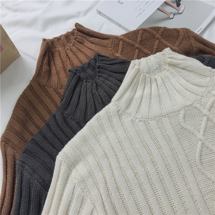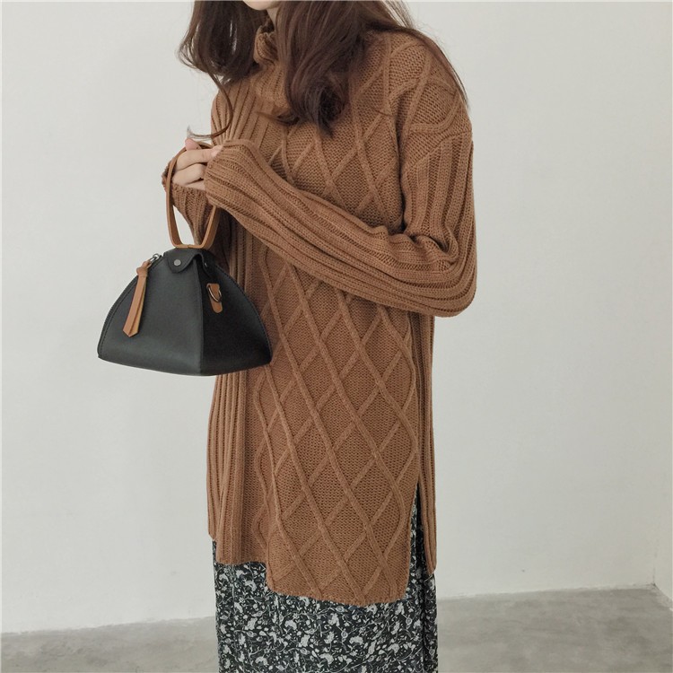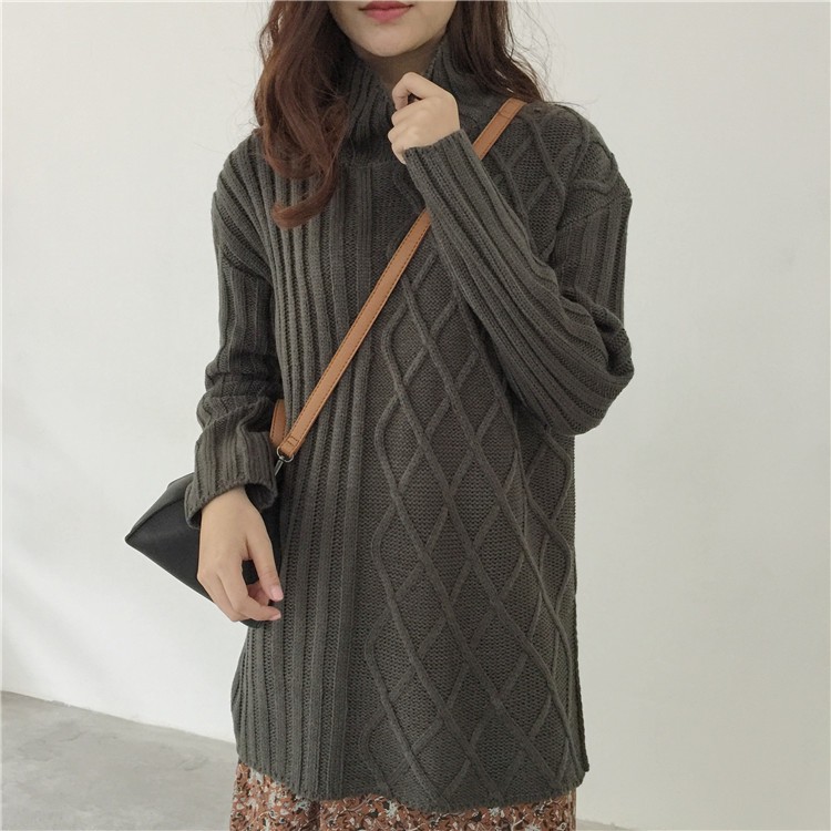冬款韓國軟妹甜美高領套頭百搭保暖麻花粗針中長款毛線毛衣女