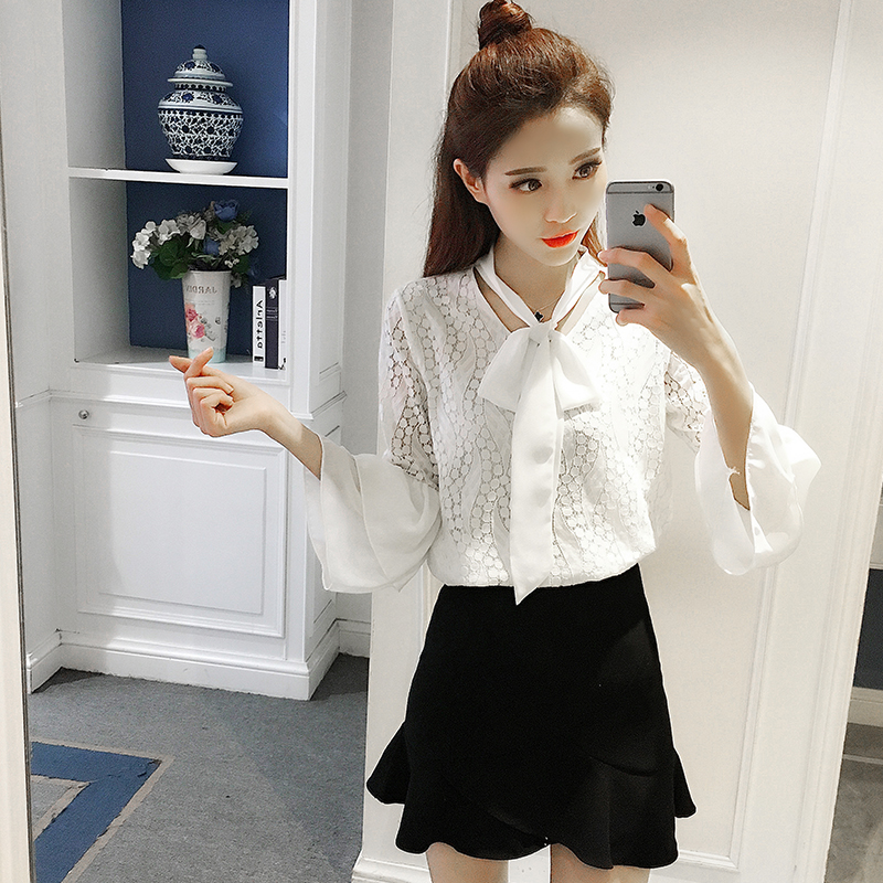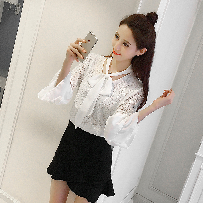 雪紡上衣女春季新款韓版拼接喇叭袖顯瘦百搭V領蕾絲衫打底衫