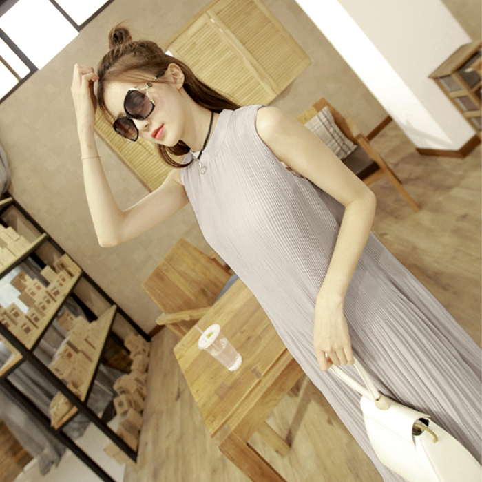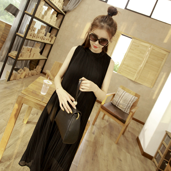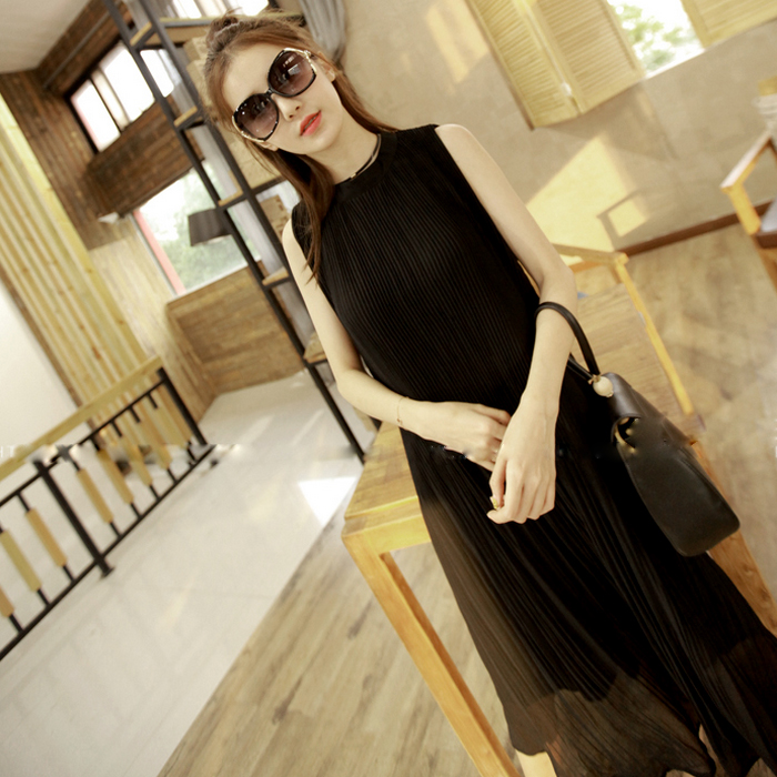 2017夏裝新款韓版裙子寬松顯瘦A字裙褶皺雪紡長裙中長款連衣裙女