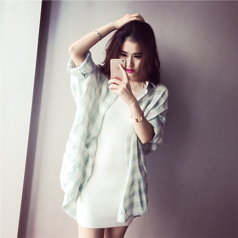 / 夏季新款韓版百搭沙灘襯衫防曬衣服女2017大碼中長款格子空調開衫