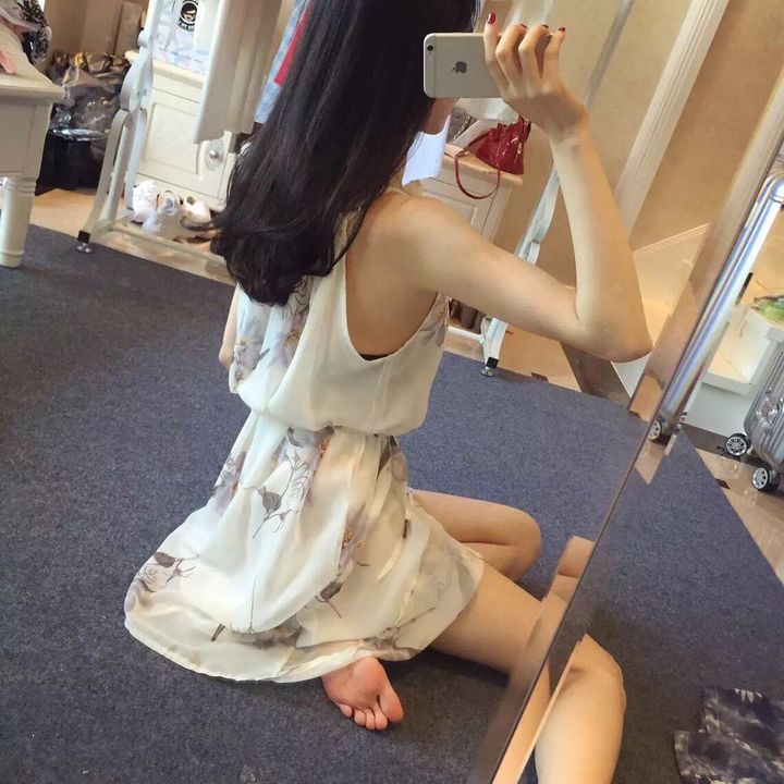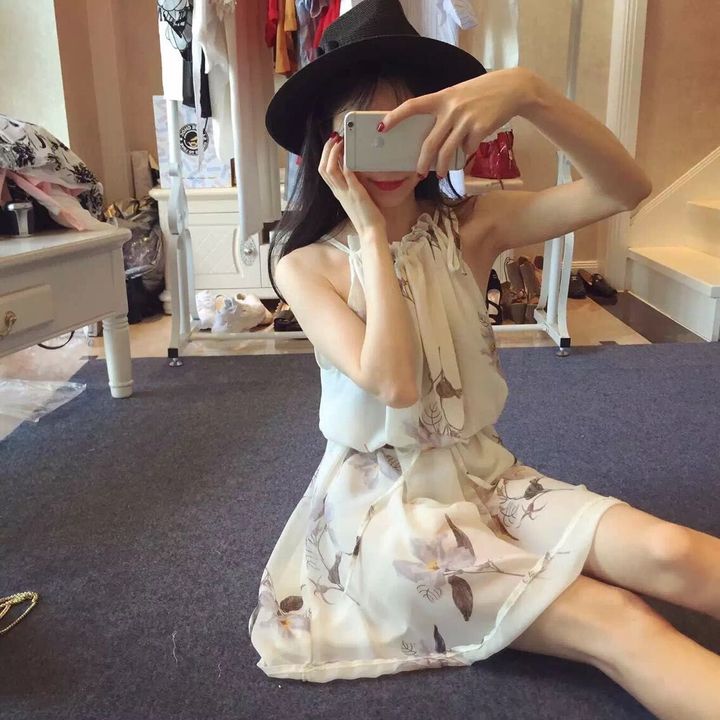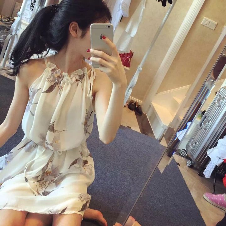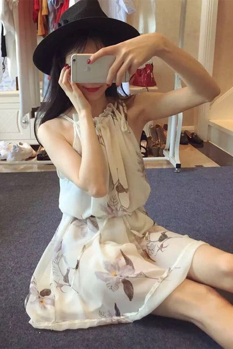 / 夏季中長款娃娃衫無袖露肩掛脖雪紡上衣女裝性感吊帶連衣裙短裙子