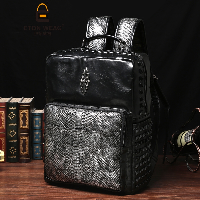 / 原創蛇紋男雙肩包日韓男士新款背包潮流鉚釘書包休閑出行旅行包