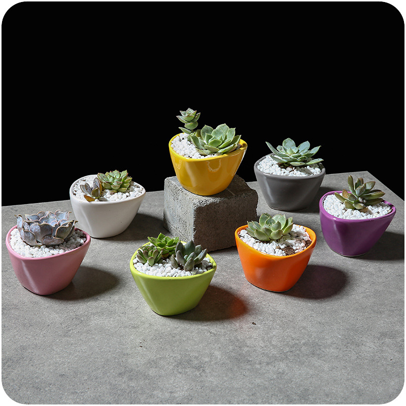 桌面創意純色多肉小花盆陶瓷花器糖果色盆簡約三角體圓形花卉盆子