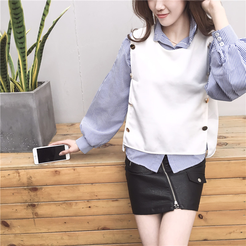 / 襯衫女長袖2017春秋新款韓范大碼寬松顯瘦泡泡袖條紋襯衣兩件套裝