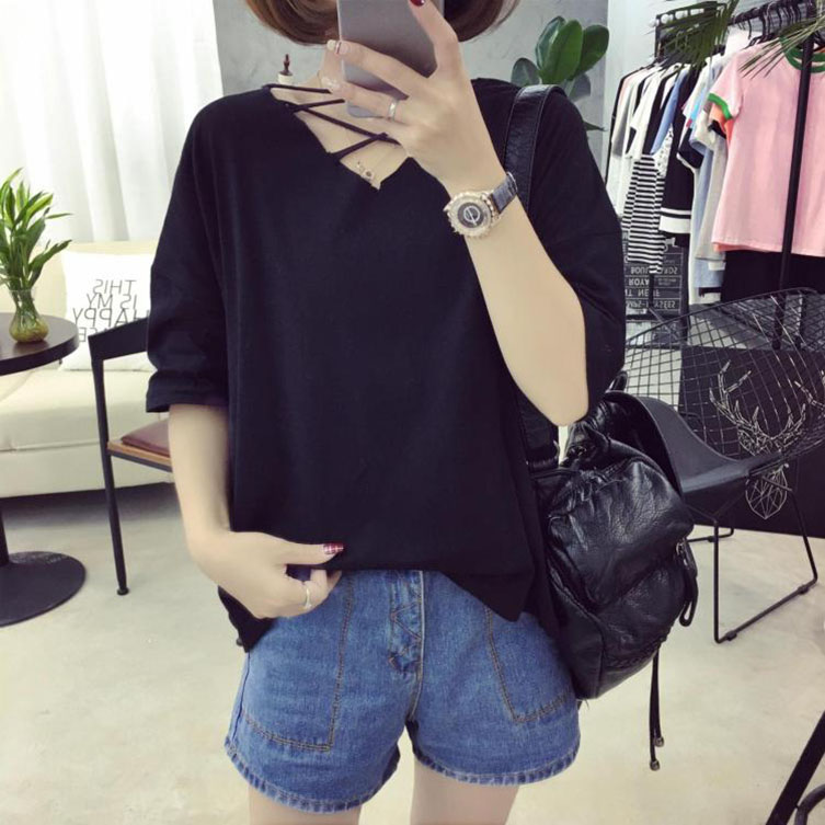 韓版春夏裝白色t恤女鏤空交叉短袖上衣服寬松夏季百搭體恤潮純色