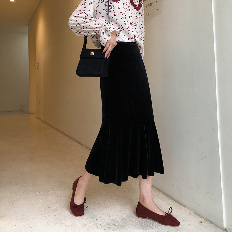 A7seven半身裙女2019春裝新款黑色A字韓版中長款荷葉邊包臀魚尾裙