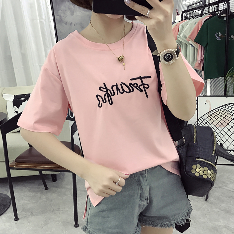 / 女裝寬松夏裝刺繡字母T恤女顯瘦打底上衣服簡約短袖t恤潮大碼