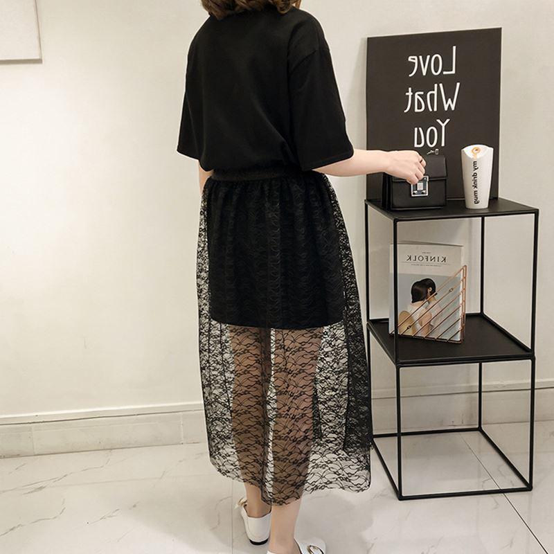 / 夏季寬松短袖印花連衣裙女中長款高腰蕾絲半身裙套裝網紗裙兩件套