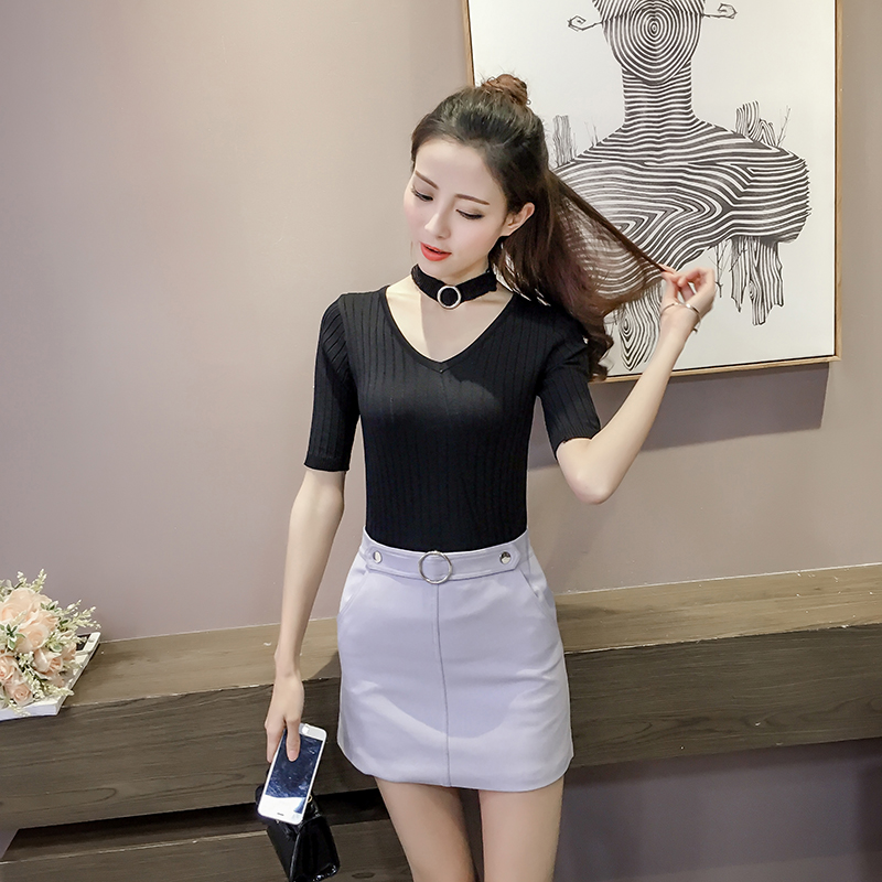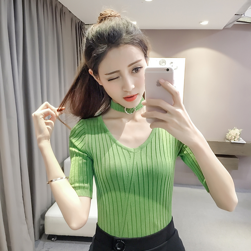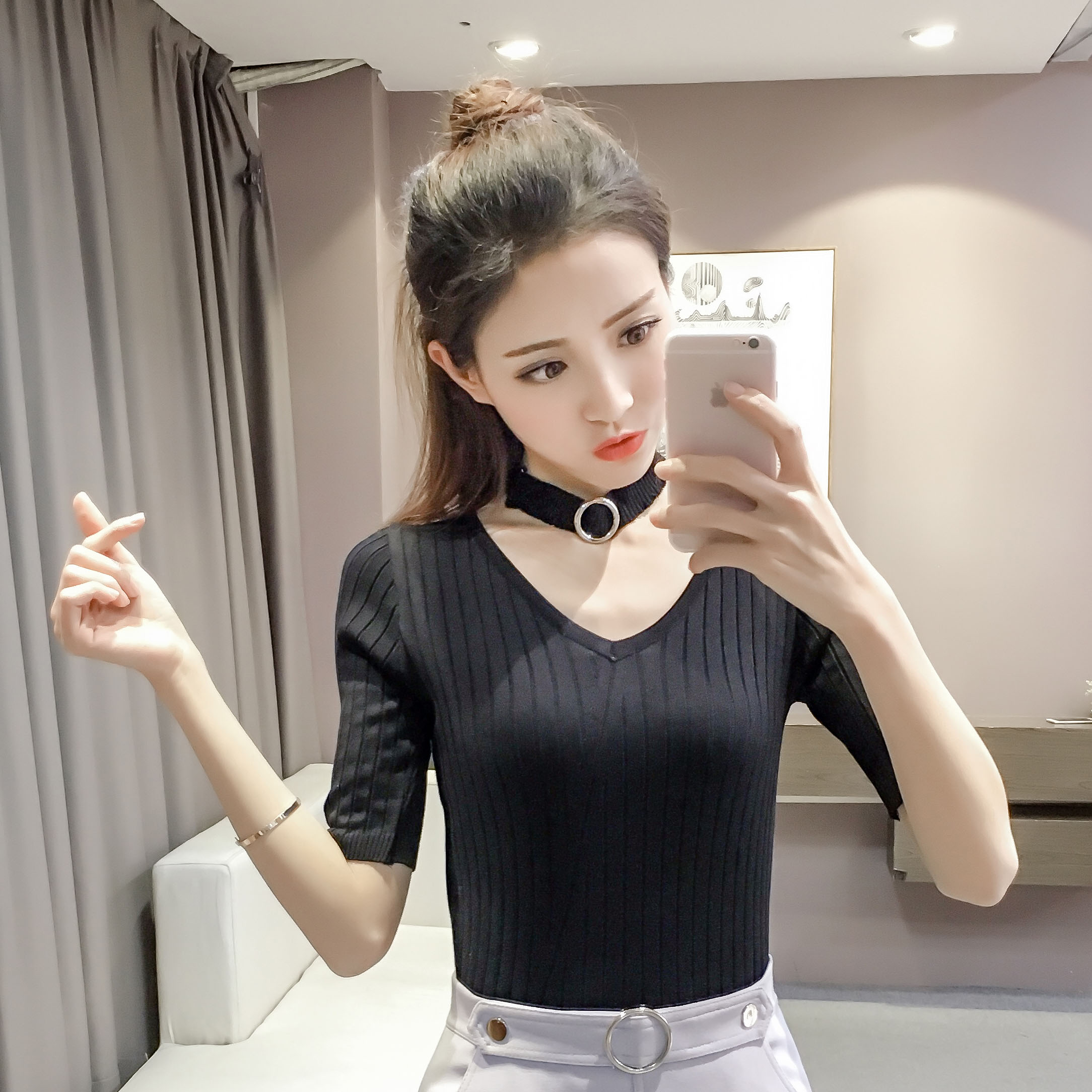 / 夏季新款韓版百搭冰絲V領上衣學生修身鏤空短袖T恤女針織打底小衫
