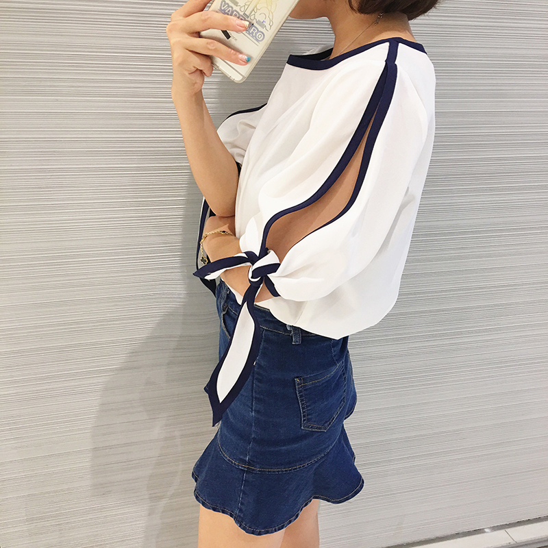 / 2017新款韓版百搭柔美雪紡衫女夏季短袖寬松露肩上衣顯瘦甜美小衫