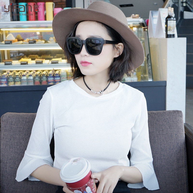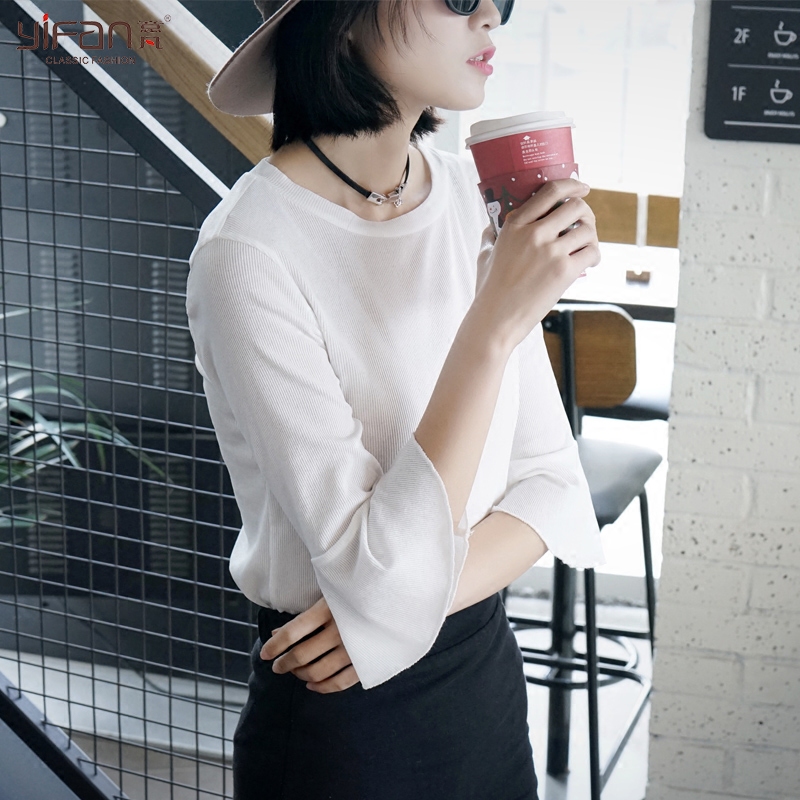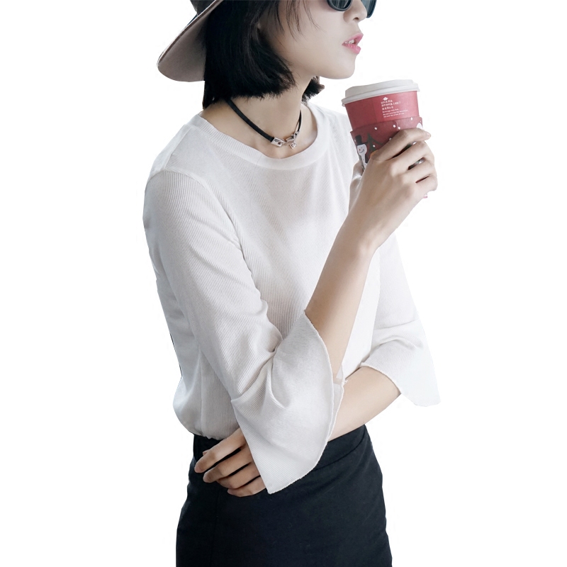 / 春夏季七分袖女T恤喇叭袖上衣修身套頭白色圓領打底衫韓版荷葉邊
