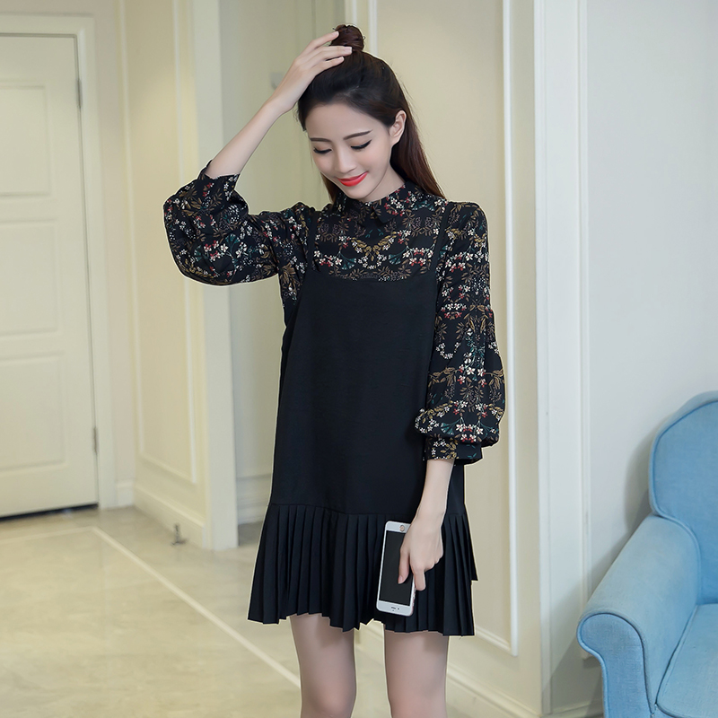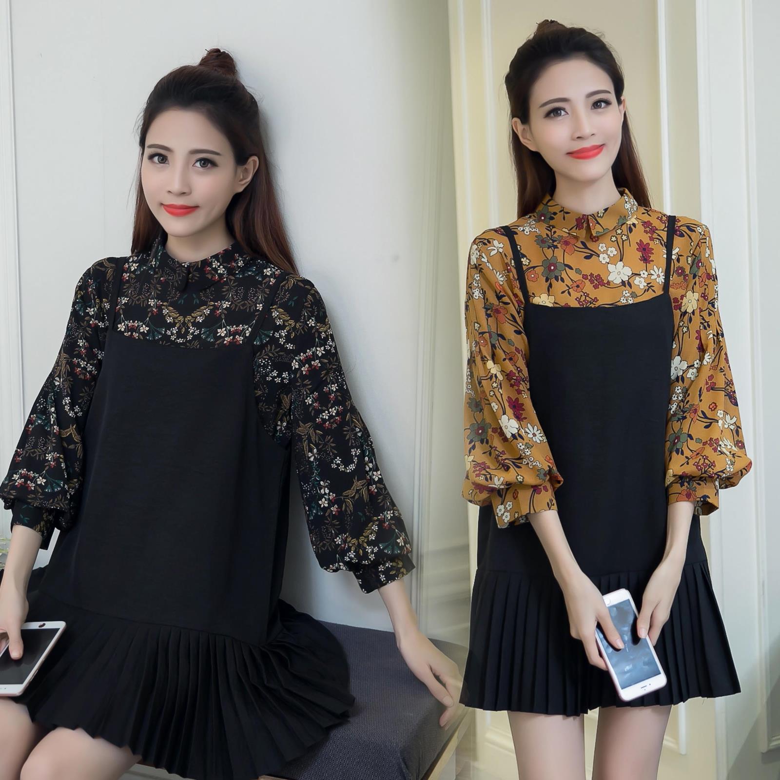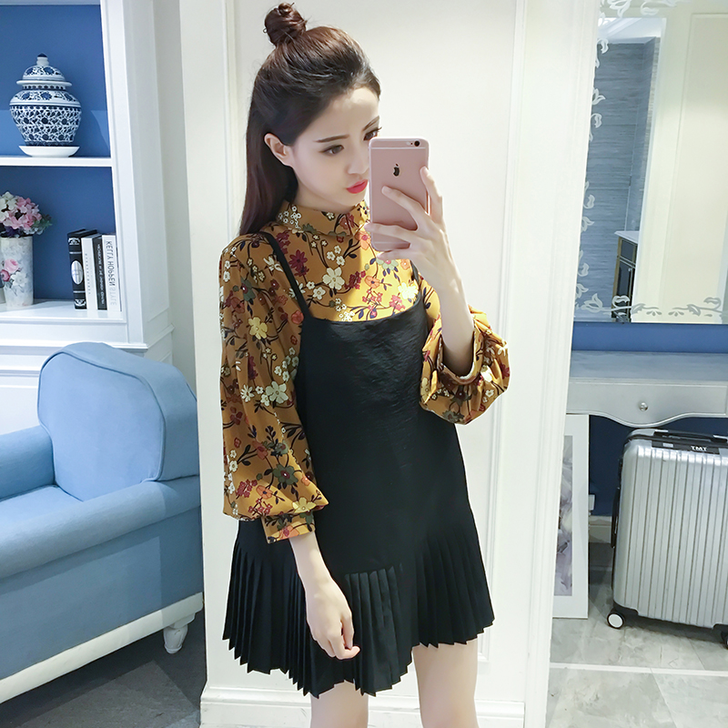 / 春秋裝新款女裝復古印花兩件套顯瘦百褶中長款吊帶碎花連衣裙