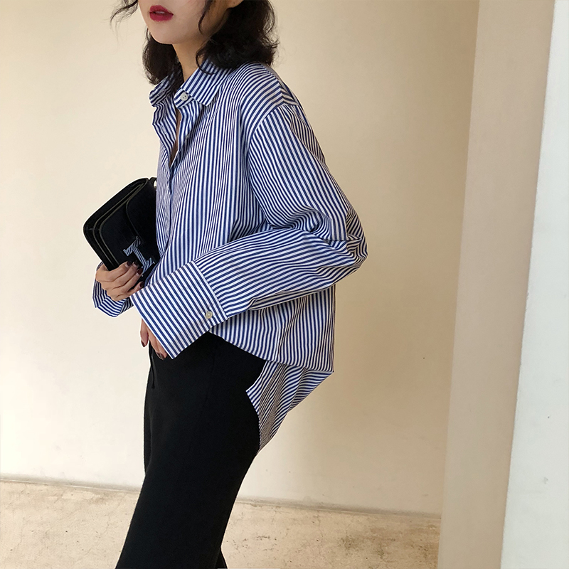 A7seven豎條紋襯衫女2019春裝新款藍色韓版翻領長袖寬松顯瘦襯衣