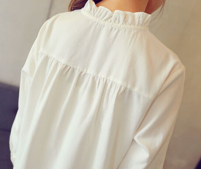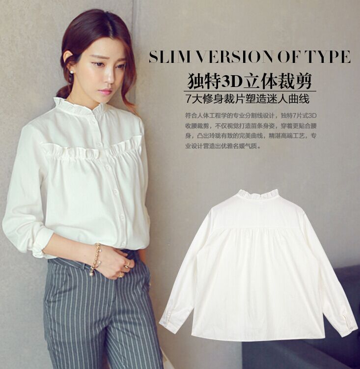 2017春秋裝韓版上衣大碼女裝雪紡荷葉花邊立領襯衫長袖打底襯衣女