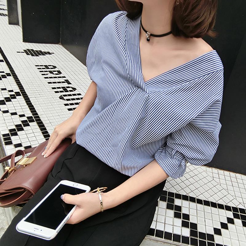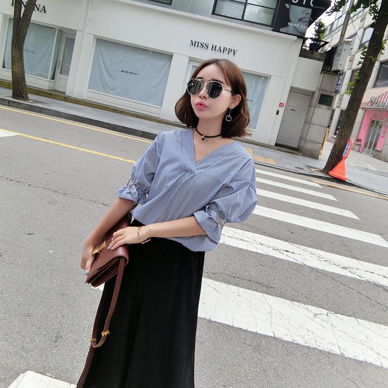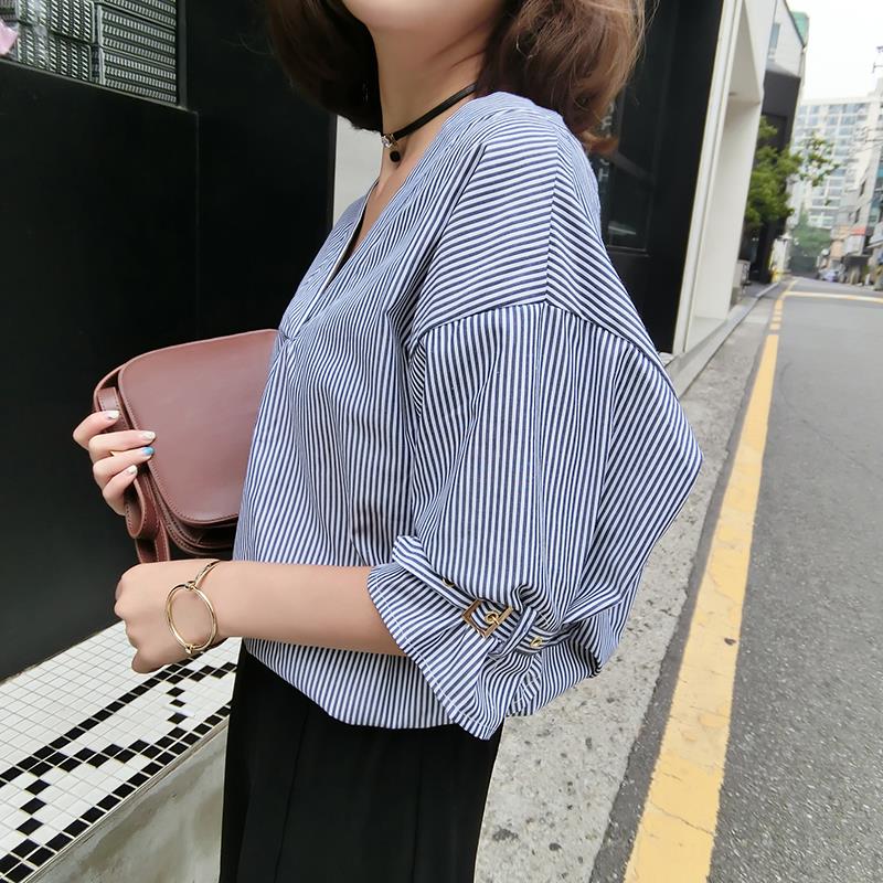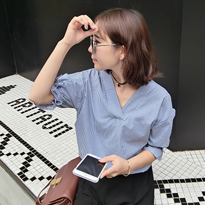 / 2017夏季新款韓范寬松V領豎條紋襯衫女短袖露背鏤空襯衣學生上衣