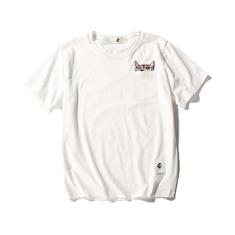 新款日系復古口袋刺繡貓印花男士短袖T恤半袖