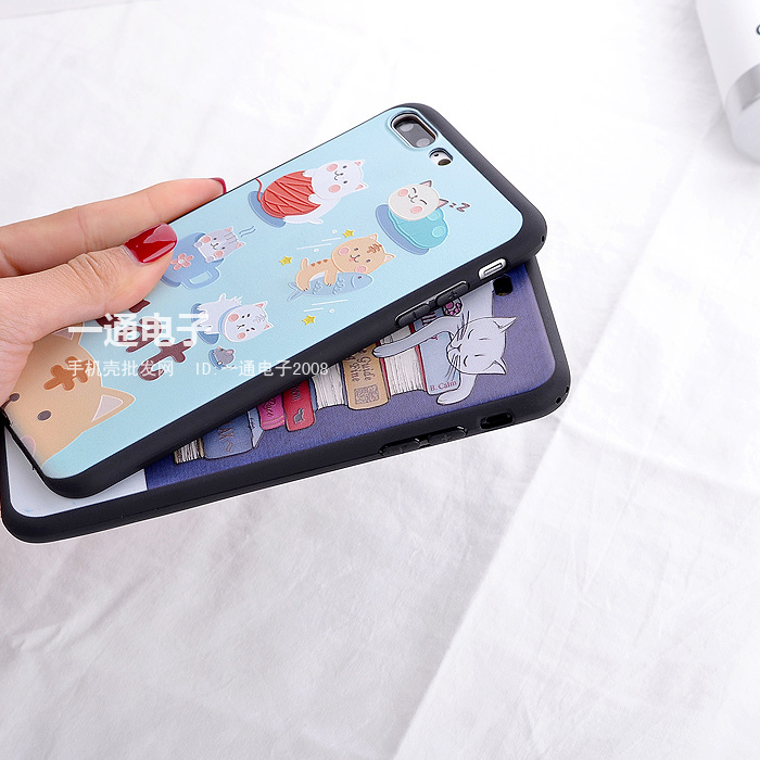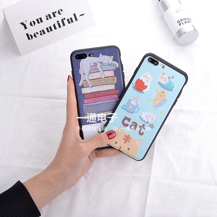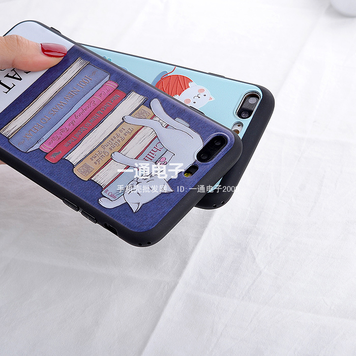 日韓浮雕睡書貓iphone7手機殼情侶蘋果6plus全包硅膠套掛繩6s女潮