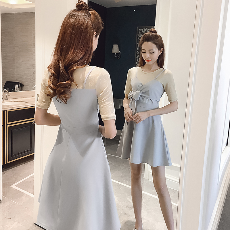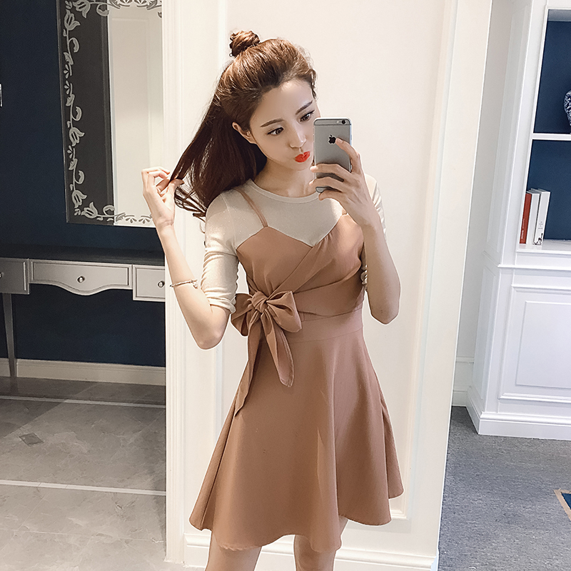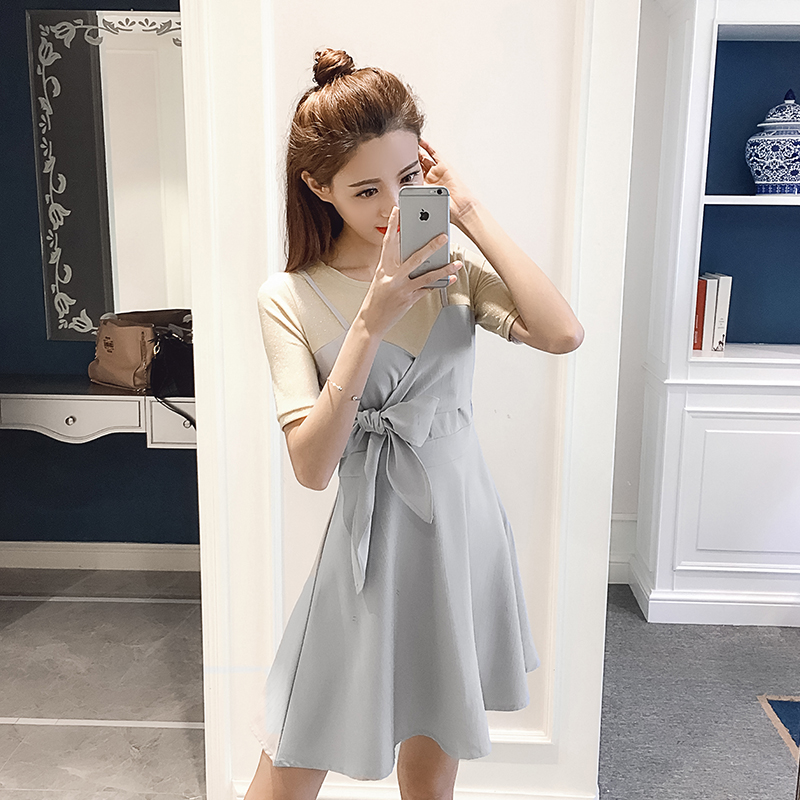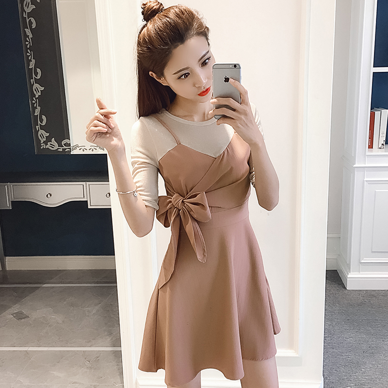 / 夏季新款女裝韓版蝴蝶結假兩件拼接中長款修身收腰短袖連衣裙