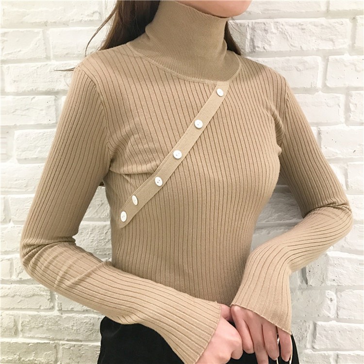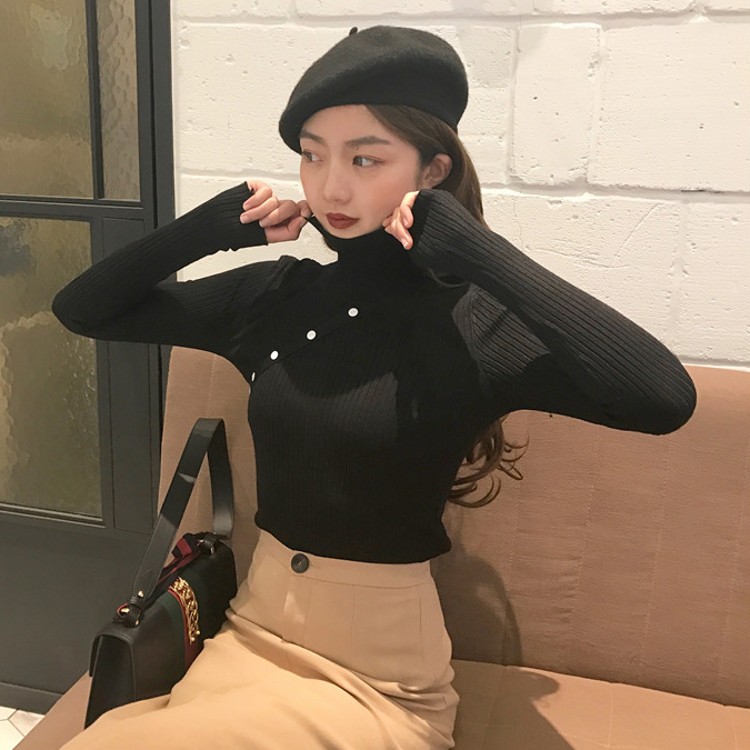 冬款韓國chic風斜扣豎條紋修身百搭高領套頭長袖打底針織衫女
