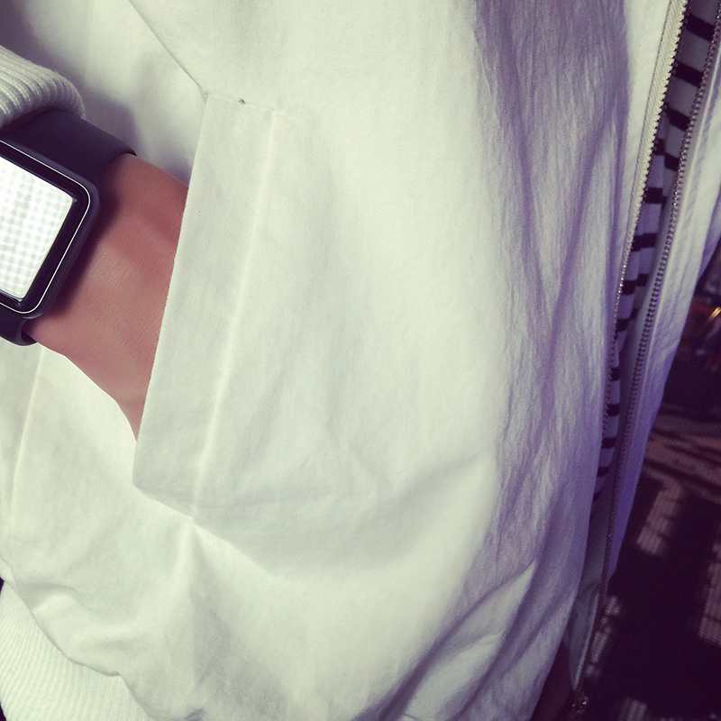這款夾克有點擴版型。落肩設計。棒球領設計。都是今年韓風最流行的元素。