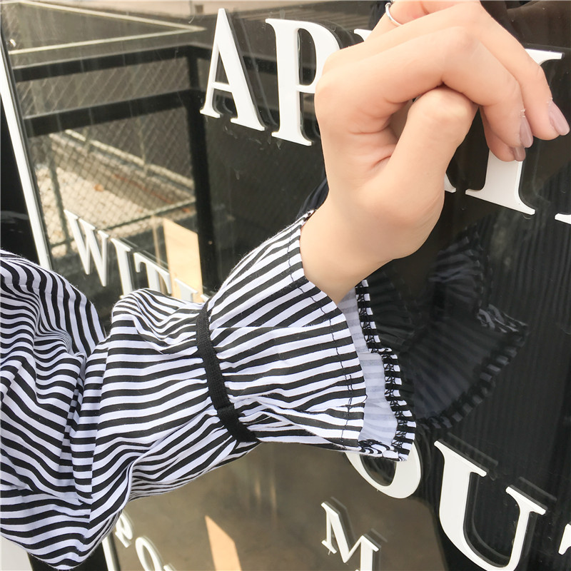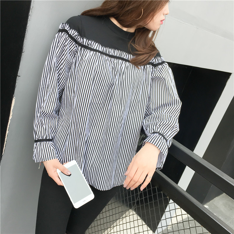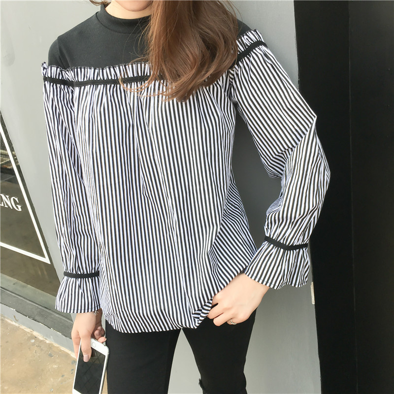 / 2017春秋新款韓國學院風針織拼接半高領條紋百搭襯衣女學生襯衫潮