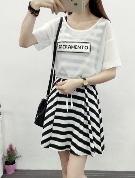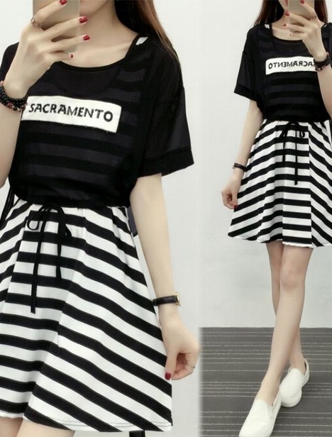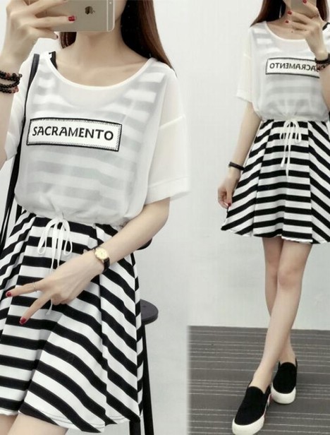 / 韓版夏季小清新條紋連衣裙女短袖雪紡罩衫吊帶背心裙兩件套裝裙子
