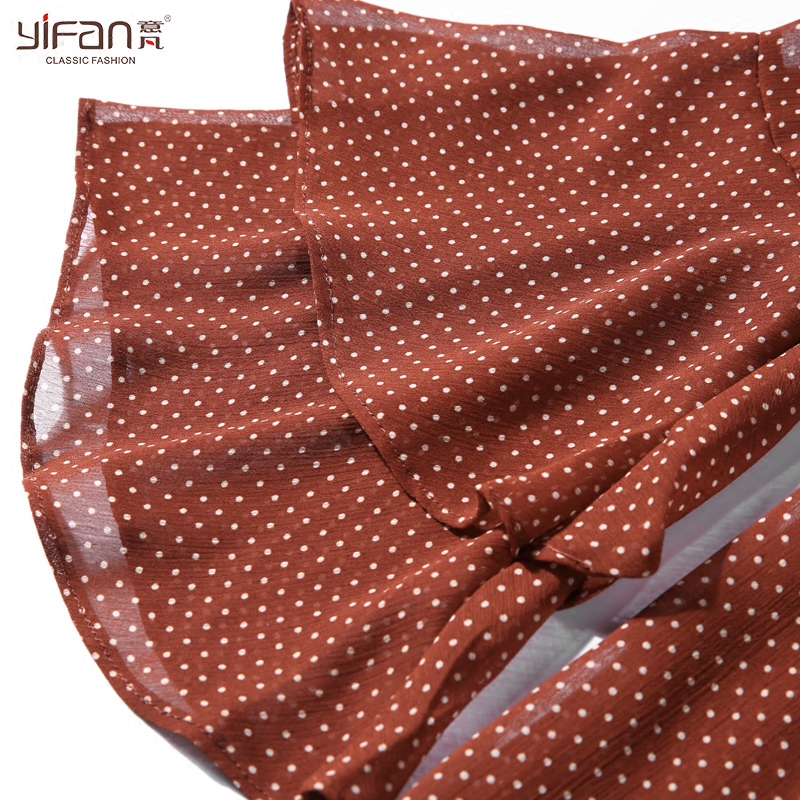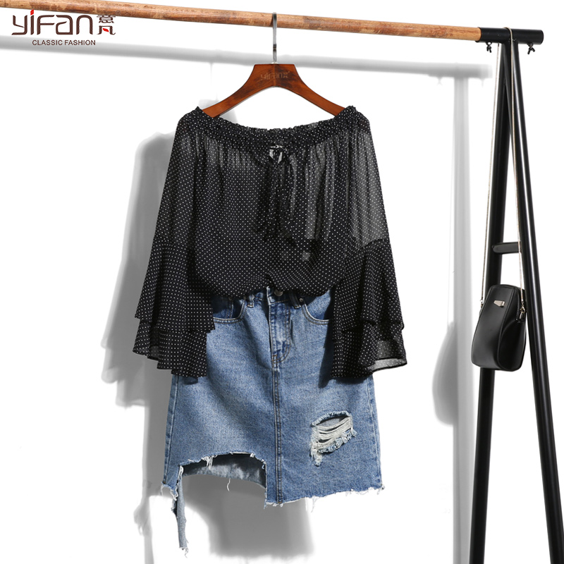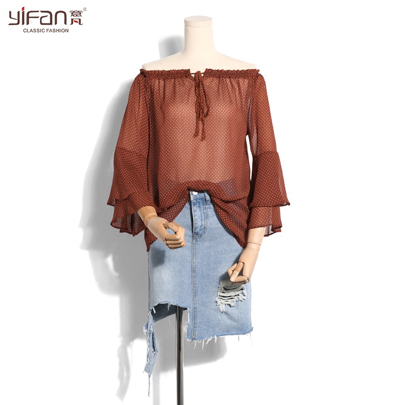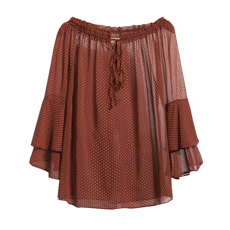/ 夏裝新款韓版寬松雪紡衫女圓點印花喇叭袖荷葉邊一字肩露肩上衣潮