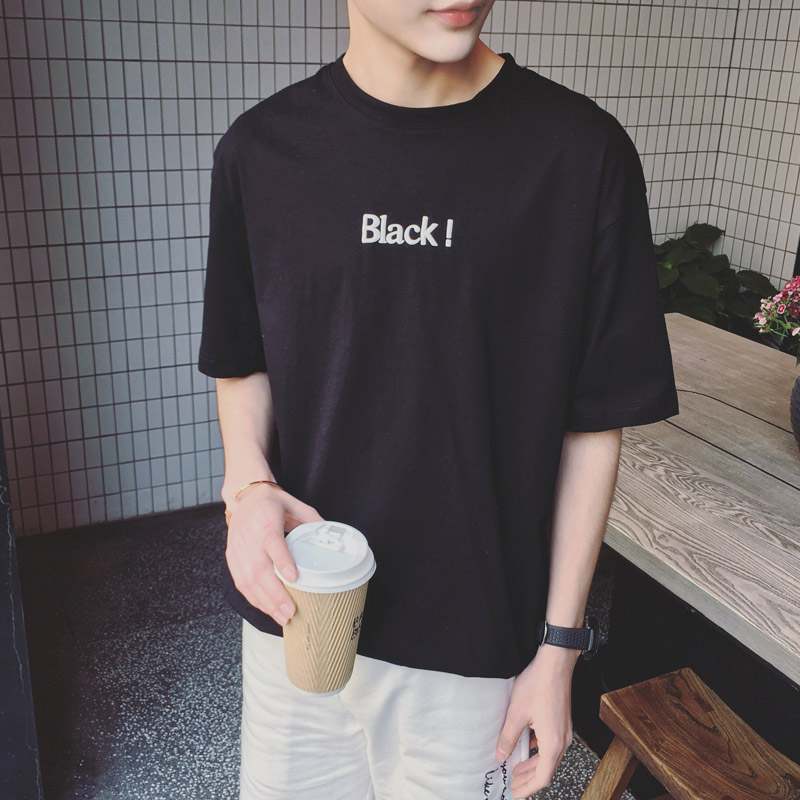/ 原創設計字母繡花港風寬松純色百搭男士短袖T恤潮