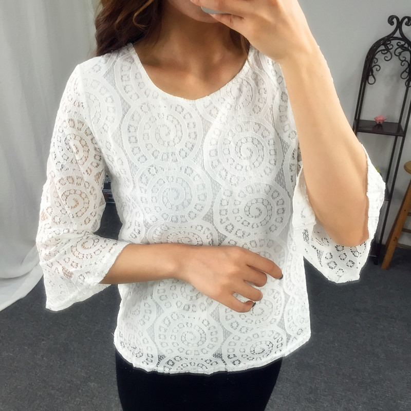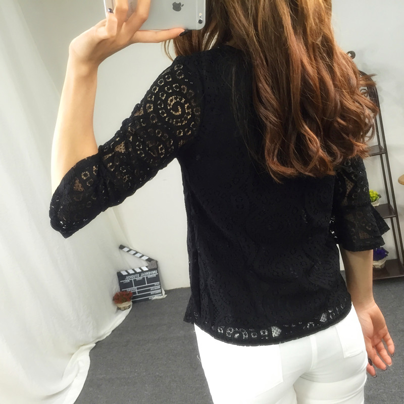 / 夏季女裝氣質百搭新款蕾絲上衣短袖罩衫修身短款鏤空針織衫女套頭