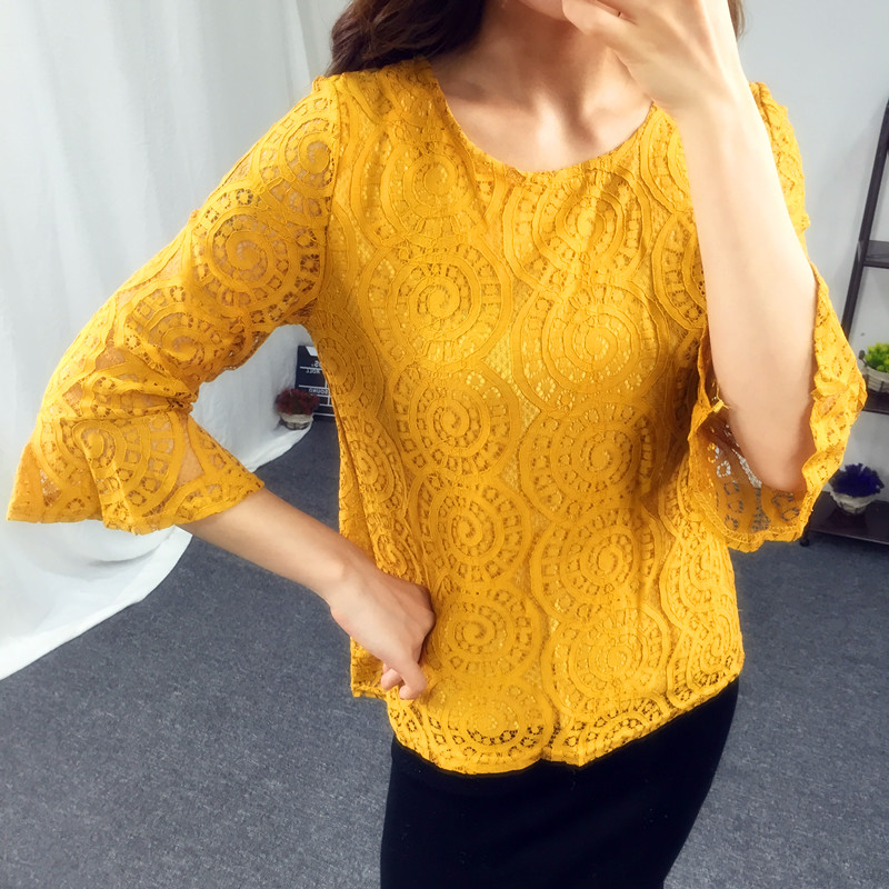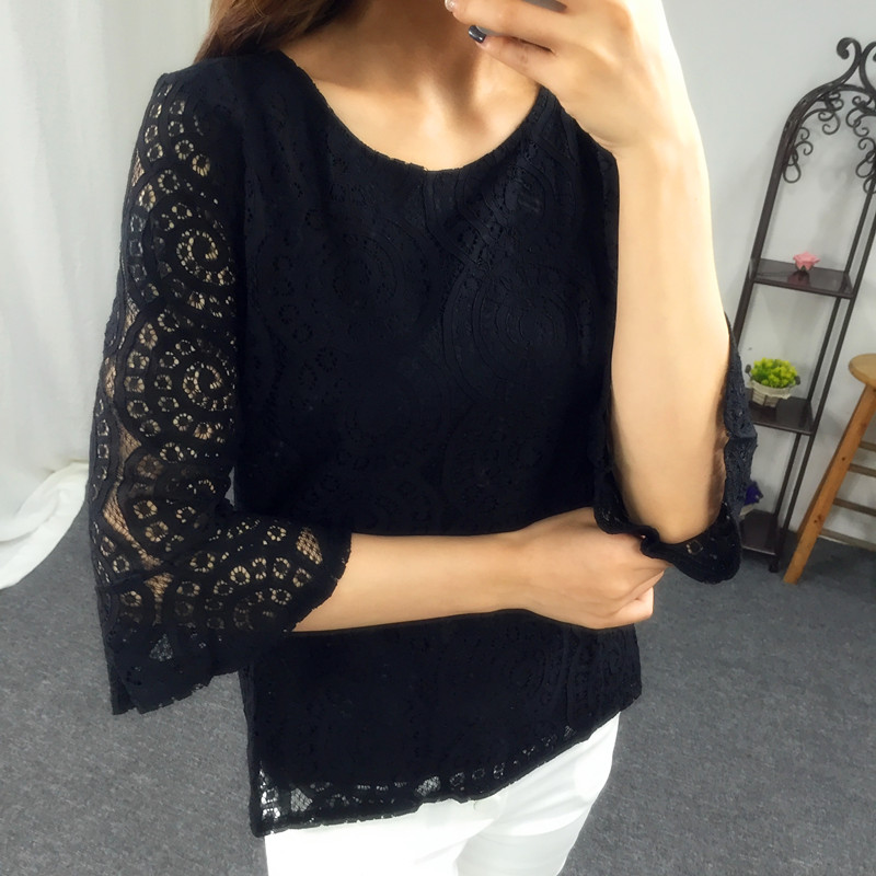 夏季女裝氣質百搭新款蕾絲上衣短袖罩衫修身短款鏤空針織衫女套頭