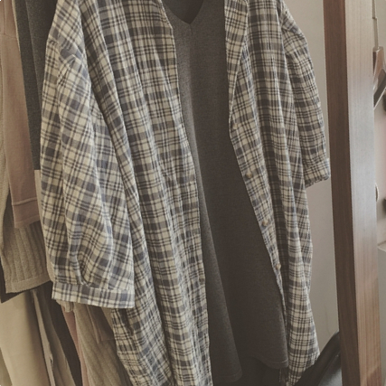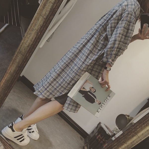 / 韓版學院風寬松格子襯衣 百搭減齡七分袖娃娃衫中長款襯衫女夏裝