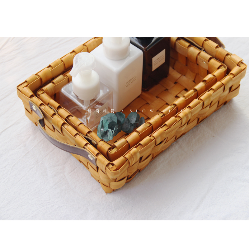 樸簡 日式田園風原木木片收納籃 手提面包籃 餐具桌面水果收納籃