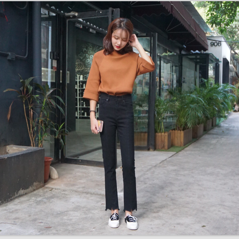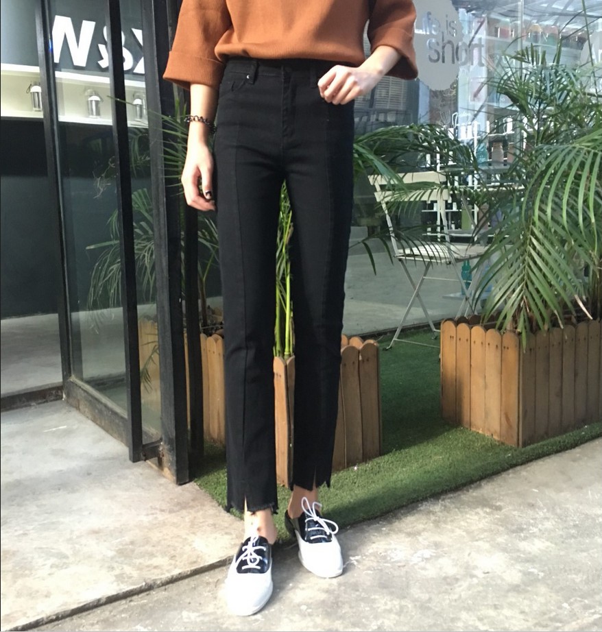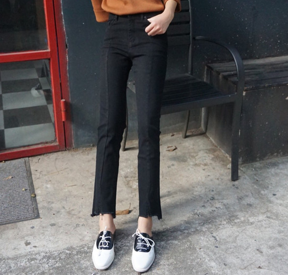 韓國秋冬款顯瘦修身開衩不規則微喇叭褲黑色高腰牛仔褲長褲女