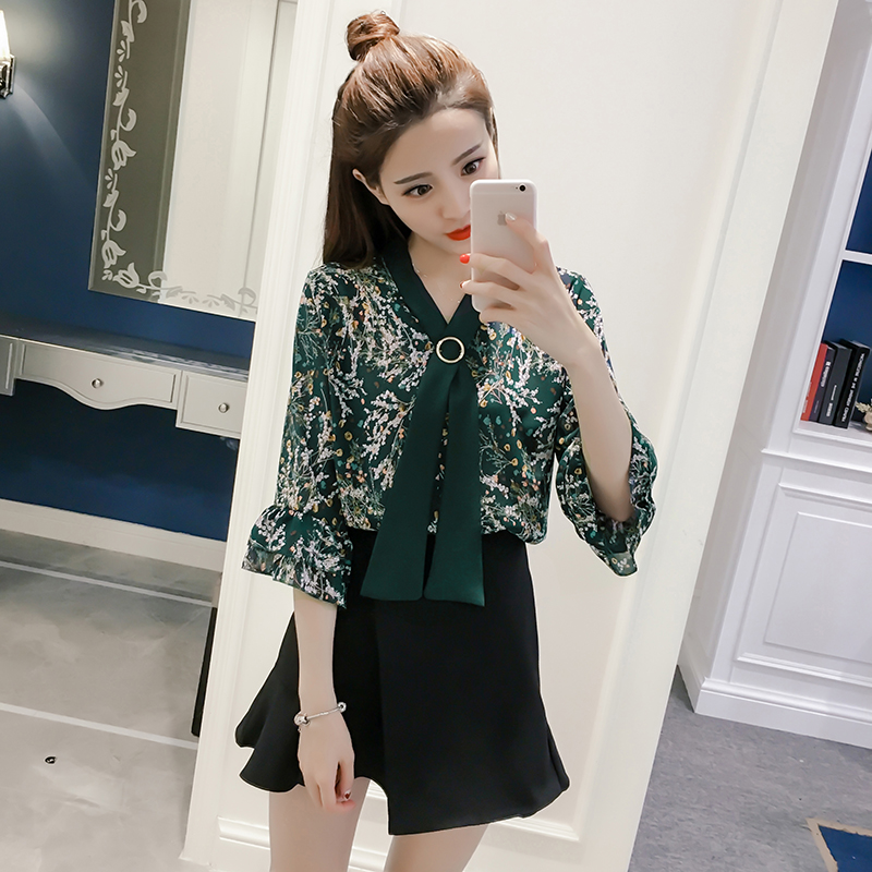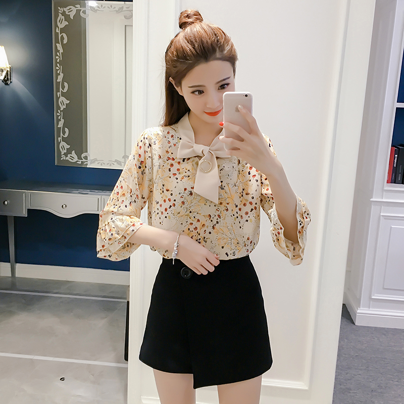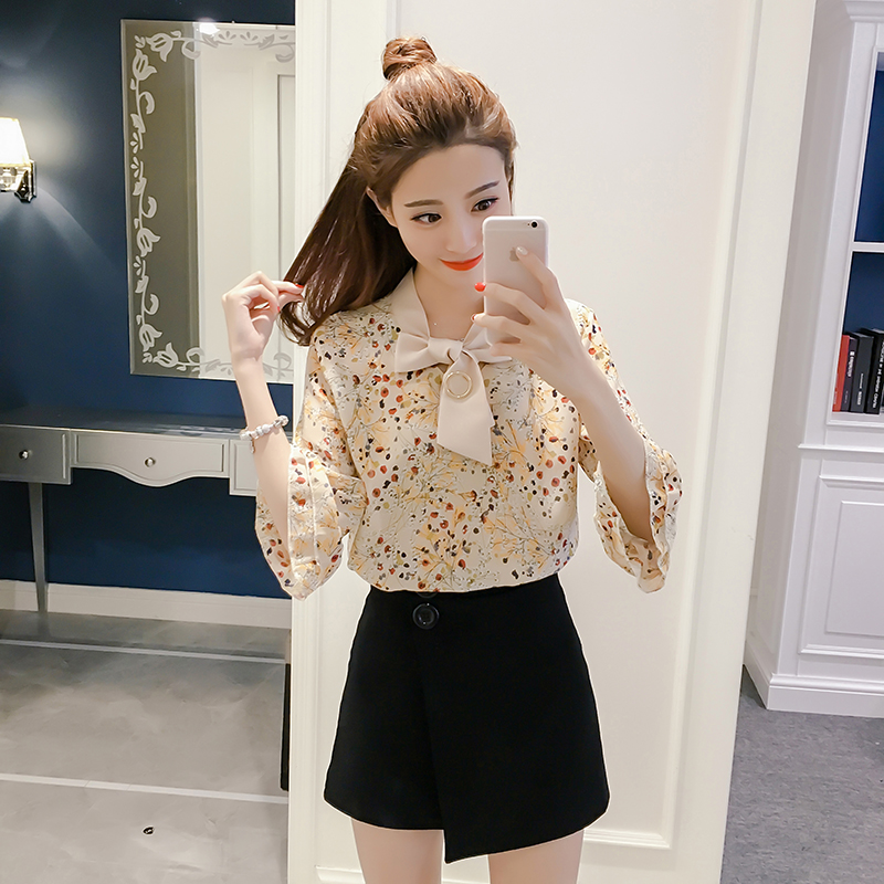 / 春夏新款女裝荷葉邊印花小衫顯瘦百搭七分袖碎花雪紡衫女上衣