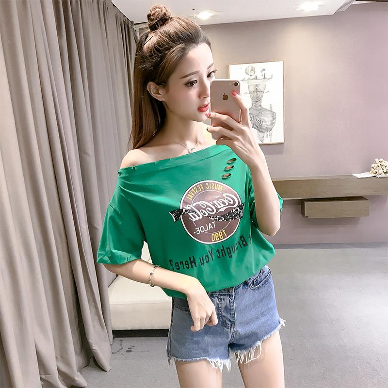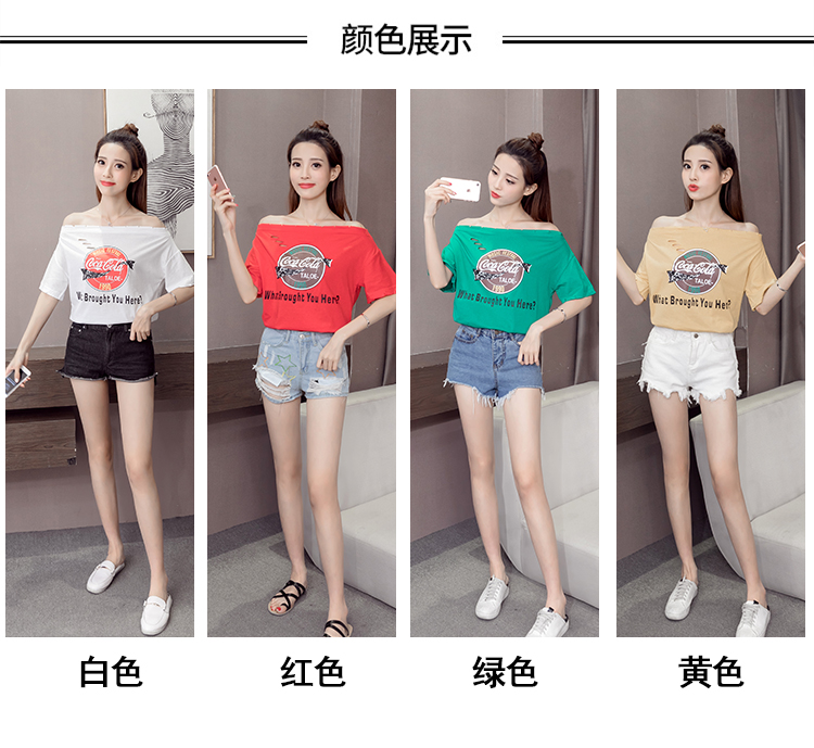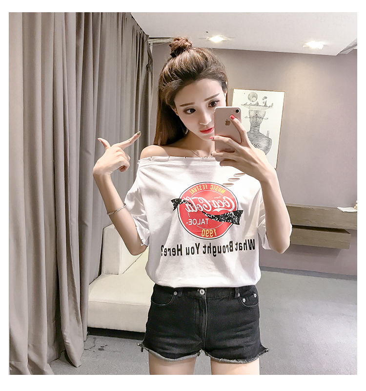 / 2017夏季新款韓版氣質露肩一字領短袖上衣時尚百搭破洞印花T恤女