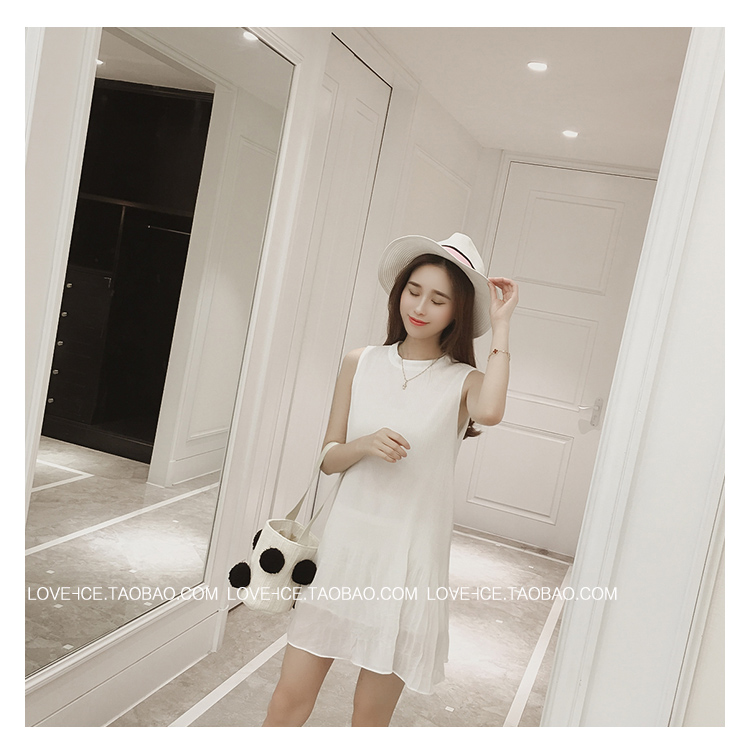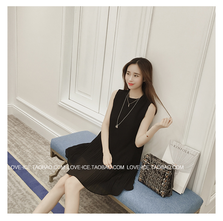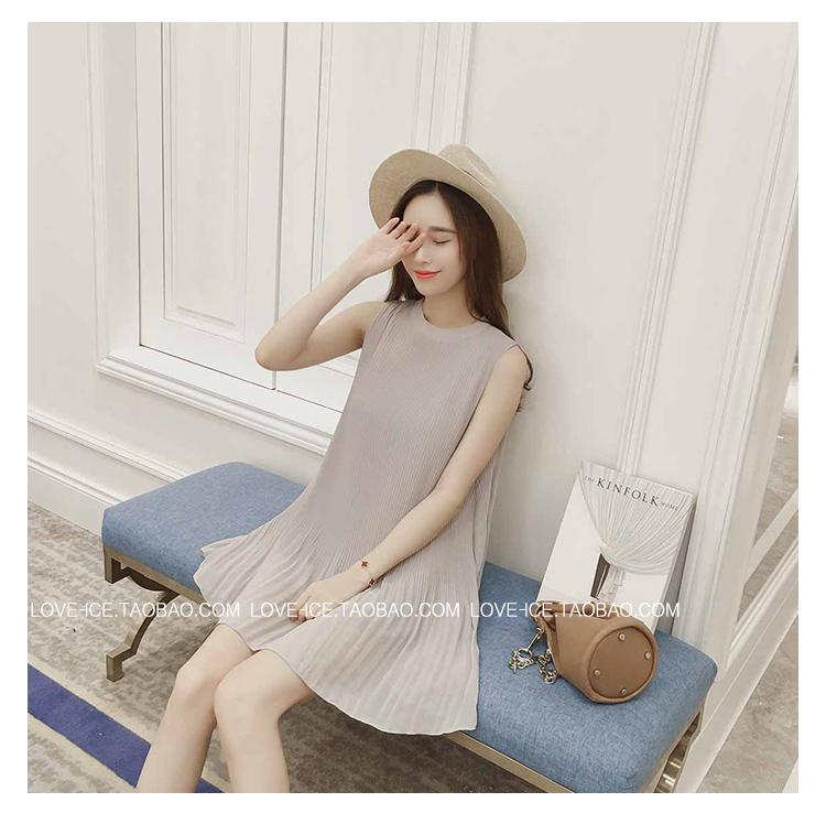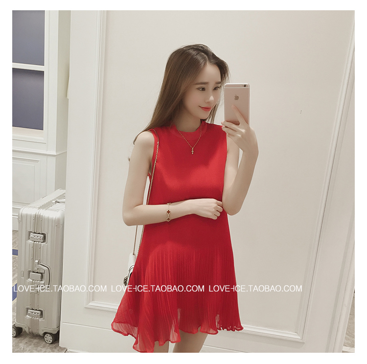 / 2017夏新款韓版顯瘦紅色背心裙圓領大碼百褶中長款寬松雪紡連衣裙