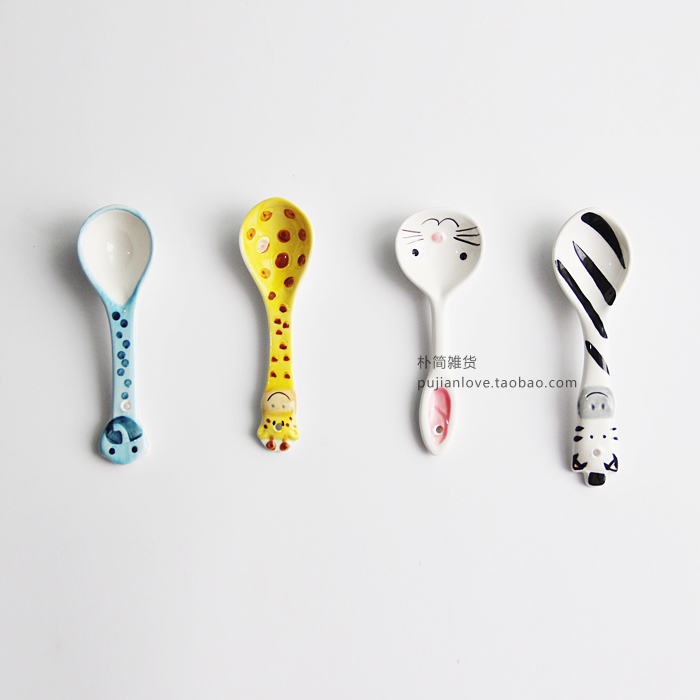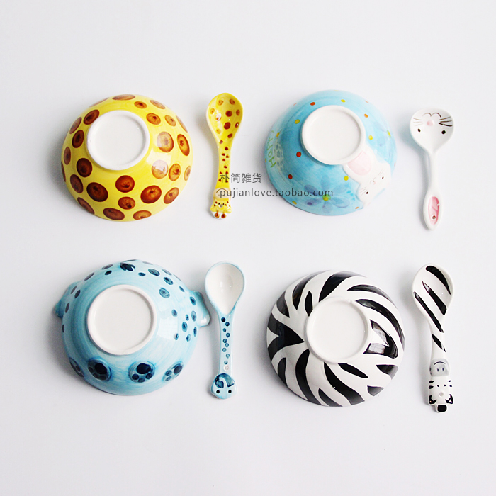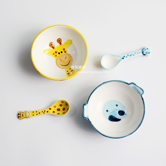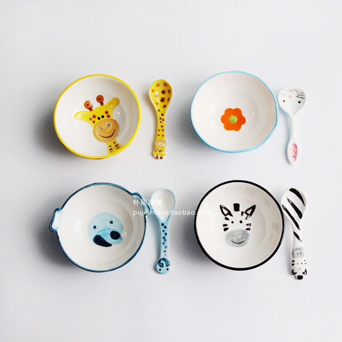 卡通動物釉下彩陶瓷碗 兒童餐具套裝創意可愛寶寶輔食碗勺