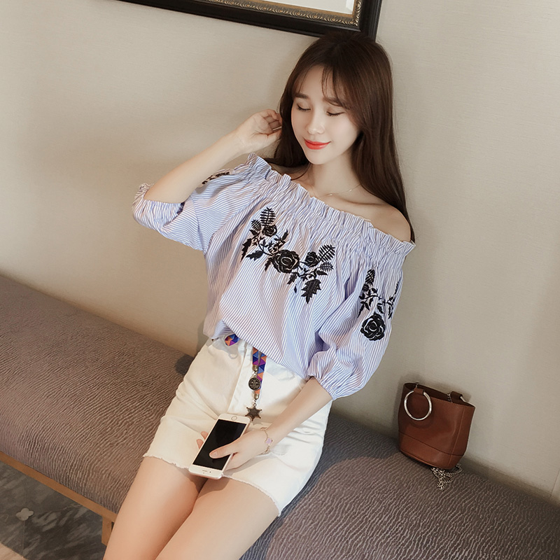 / 美亦隨興夏季甜美泡泡袖花朵刺繡娃娃衫一字領寬松短袖套頭上衣女