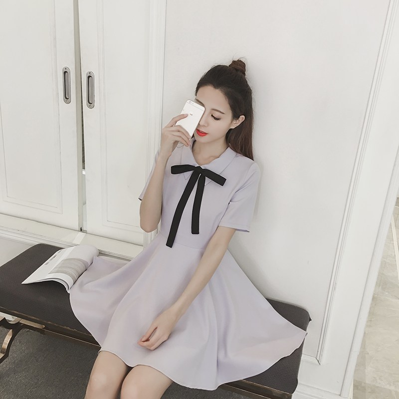 春夏新款女裝學院風蝴蝶結氣質小黑裙甜美收腰顯瘦短袖連衣裙