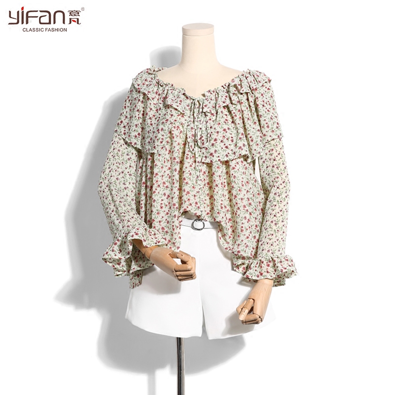 / 韓國春夏仙氣小碎花喇叭袖系帶雙層荷葉領清新雪紡娃娃衫上衣顯瘦
